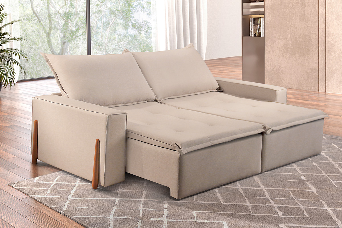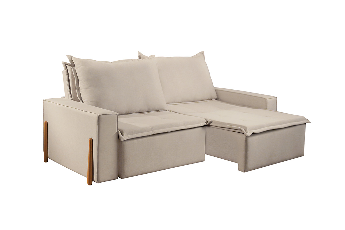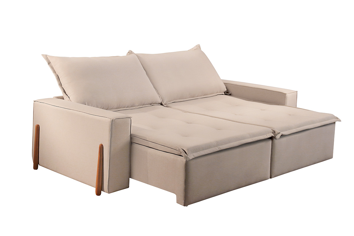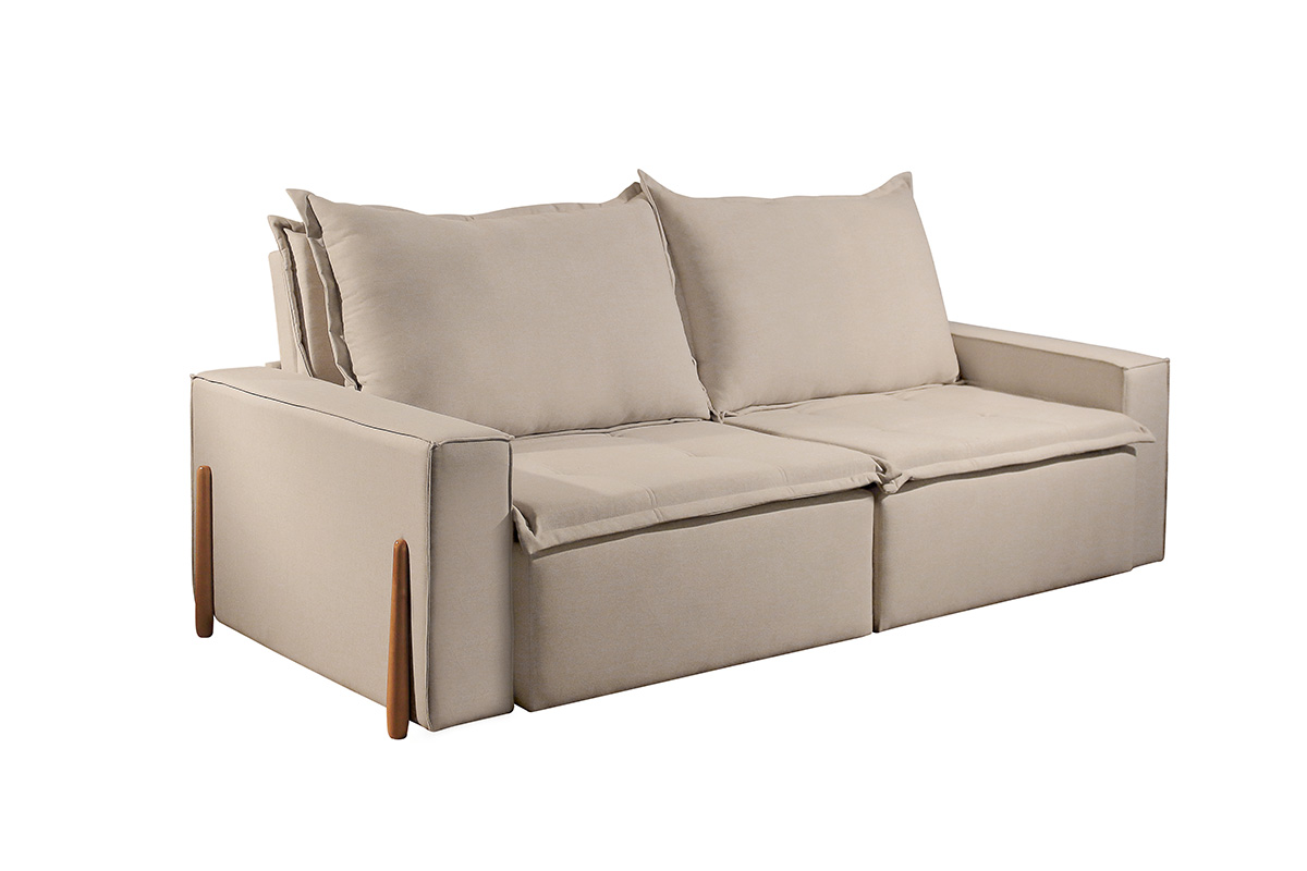 Encosto reclinável com almofadas soltas e preenchidas de fibras de silicone.