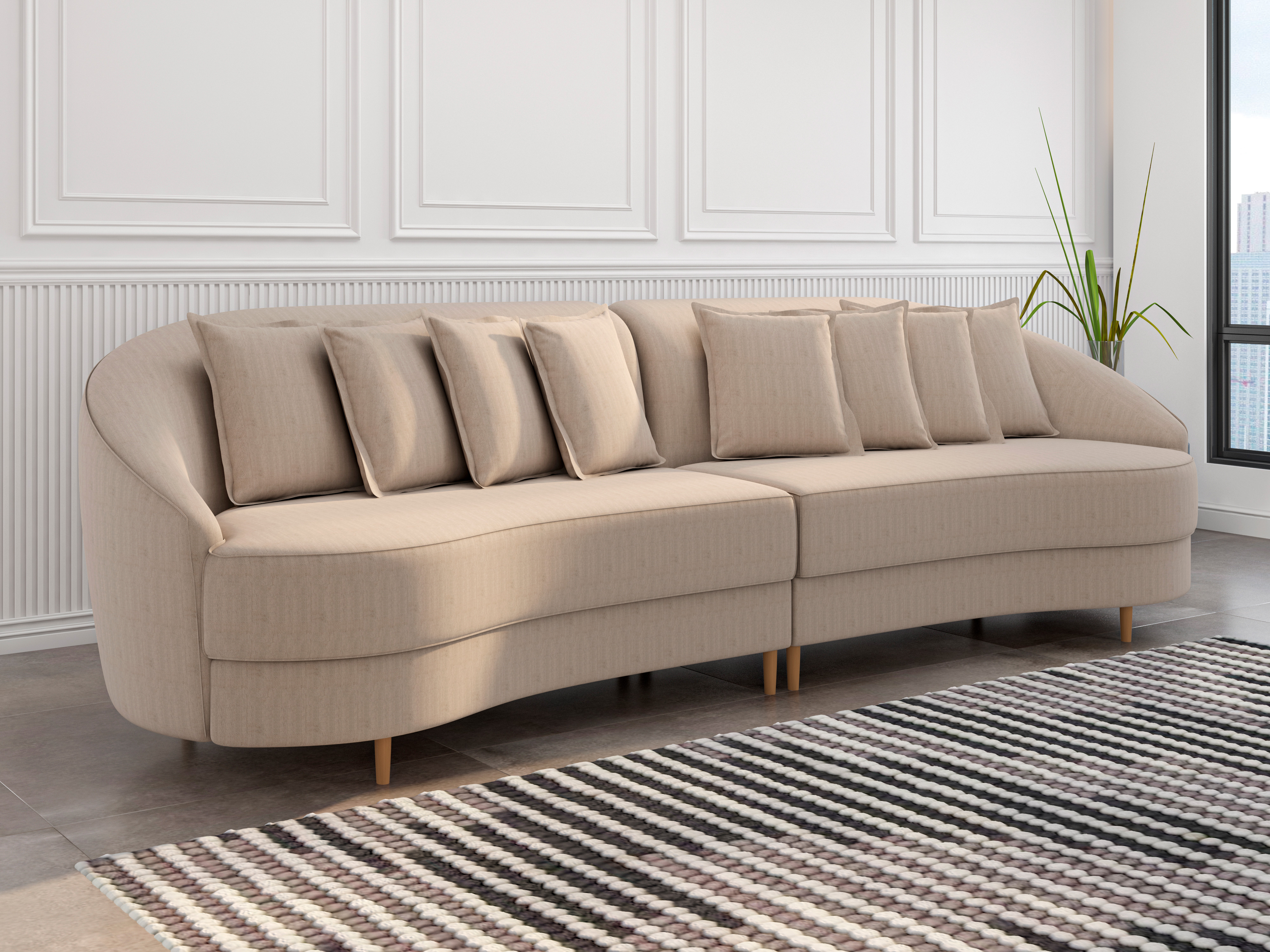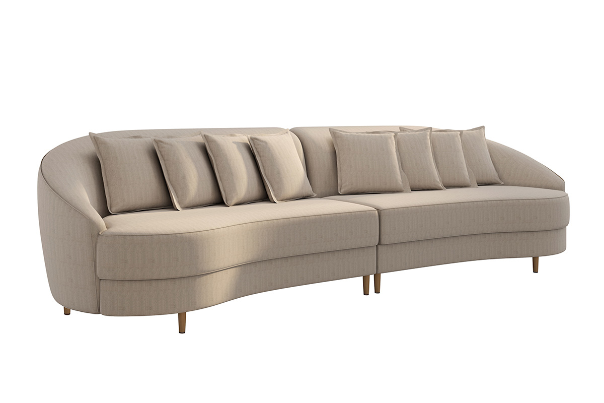 Encosto fixo com almofadas soltas e preenchidas de fibras de silicone.